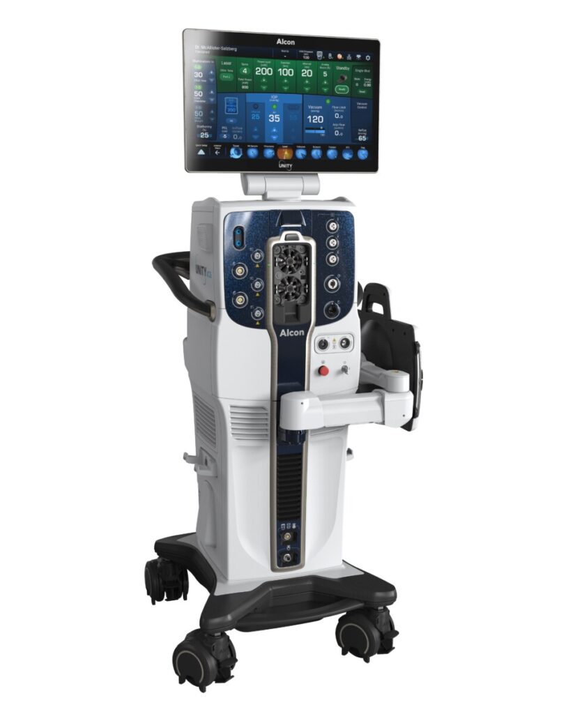 「UNITY®︎ VCS」は、白内障手術と硝子体手術を1台で効率的に行える手術システムです。高速硝子体カッター、精密な眼内圧制御、効率的な灌流・吸引機能を搭載しています。それにより低侵襲で安全性の高い手術を可能にし、患者さんの負担を軽減します。